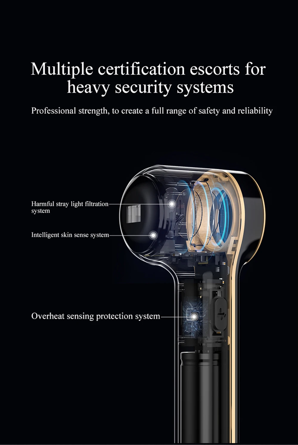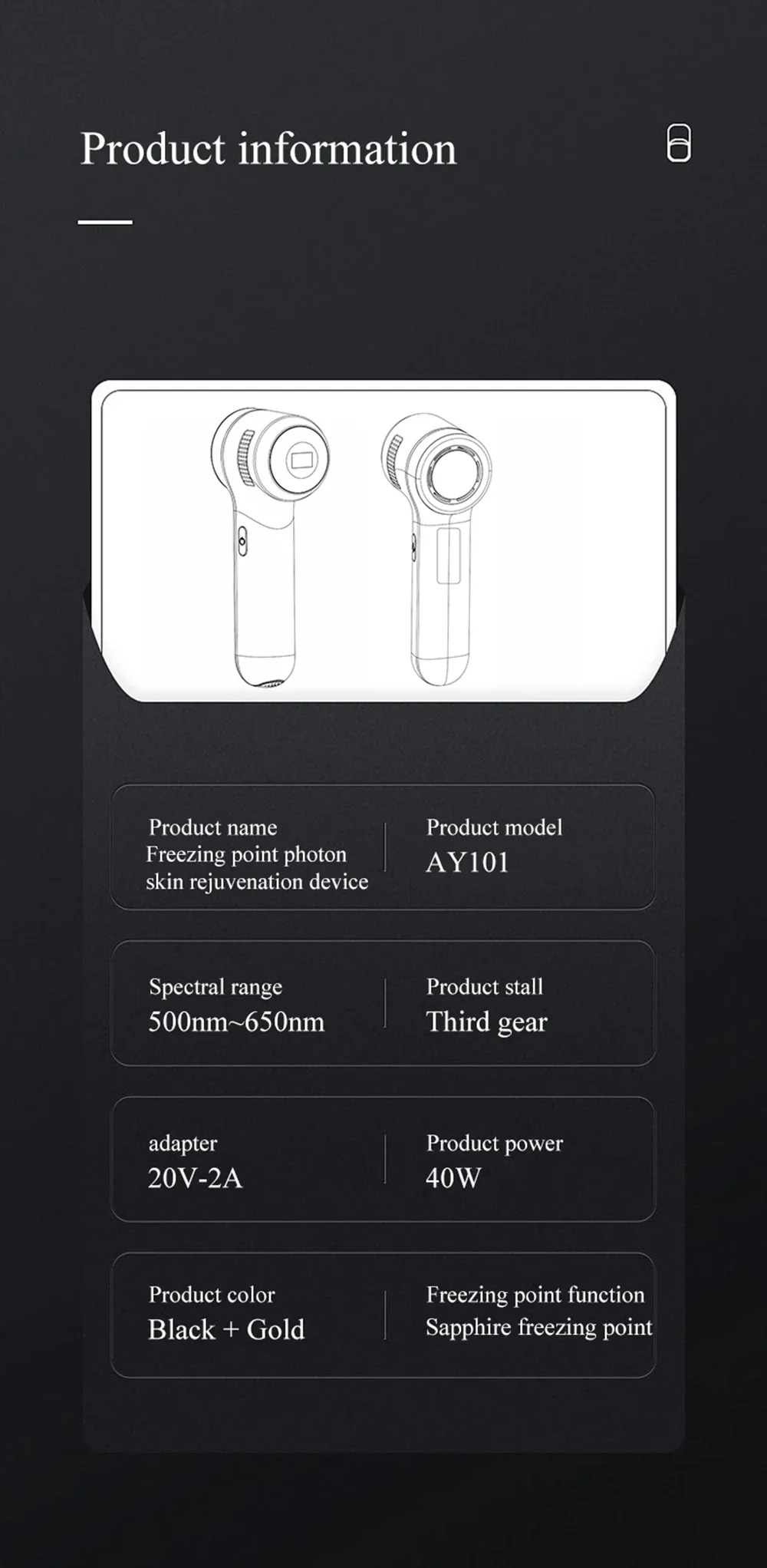 DPL Skin Rejuvenation Freezing point Beauty Instrument Stroboscopic Infrared Light Ice Feeling Painless Technology Tool 2025 NewProducts DescriptionProduct name:Freezing point photon skin rejuvenation deviceSpectral range:500nm~650nmPower:40WAdapter:20V-2AProduct stall:Third gearFunciton:Freezing point function Sapphire freezing pointProduct color:Black + GoldDescription:Discover Radiant Skin withAF-101 Multifunctional Beauty Device Elevate your skincare ritual to luxury with AF-101—the pinnacle of at-home photorejuvenation. Harnessing pulsed near-infrared light technology, this innovative device delivers professional-grade results with the convenience of your vanity.Dive deeper than ever with pure physical light therapy that penetrates skin’s deepest layers and fascia, accelerating cellular renewal , suppressing melanin formation ️, and boosting collagen regeneration for firmer, youthful skin. Say goodbye to dullness, pigmentation, and redness—AF-101’s targeted narrow-spectrum light mimics the coveted "Black Gold Super Photon" treatment, now in your hands.Triple-action brilliance:1️⃣ Brighten & Even Tone: Combat dark spots and uneven texture.2️⃣ Soothe & Cool: Built-in sapphire tip glides with a refreshing chill ️, reducing irritation.3️⃣ Anti-Aging Power: Stimulate collagen for lifted, supple skin.Customize your glow with 3 adjustable intensity levels This product uses a US plug by default. For global customers, we provide a universal adapter for free, allowing you to use it easily around the world!Why wait for salon appointments?Bring the luxury of clinic-grade rejuvenation home. AF-101: Where science meets elegance, for skin that transcends time.Features1.Dpl photon rejuvenation device:Brighten and rejuvenate skinskin modification2.Sapphire non-sensory technology copes with triple troubles①No pain:Instant cooling neutralizes a burning sensation②Non-irritating Avoid thermal damage and reduce allergy rate③0 medium No need for gel to cool down, no sticky2.3 major modes 8 heavy effects: Accurately improve a variety of skin problems3.150nm precise narrow light wave: Skin rejuvenation technology revolutionary breakthrough4.Sapphire non-inductive technology:lcing improves 3 problems5.improve:Lighten skin/smooth poresDark/uneven skin toneInelasticity Coarse poreModerate:Strong light spot light print Stubborn dark spots The color is heavy and pimple marksIntensify:lmproved Redness of the face with sensitive muscles6. Rejuvenate and pop collagen Firming light lines * Strength Plain face Mild strength, weak stimulation, efficient rejuvenationFunctionPrecise black gold narrow light wavesFour major breakthrough technology advantages1. Double the effect:One black gold rejuvenation = multiple traditional optical rejuvenation, at the same energy, through the light wave purification technology.The cffective energy of black gold skin rejuvenation compared with traditional skin rejuvenation.Double the effect, faster results.2.Focus on whitening and flushing out red :Improves spot dullness and redness3.Slide out the light:Intelligent flash technology, automatie lighting Quickly complete the use of the whole Face,saving time and effort and worry4.Full comfort:Efficient filtration of clutter and harmful light waves.Every light is safe and effective, uniform energy, avoid Surface skin on the table.
