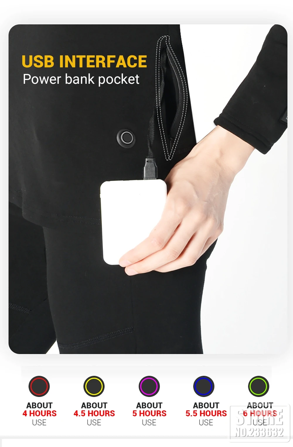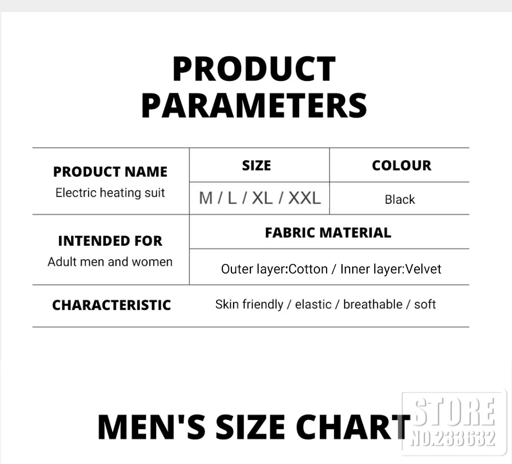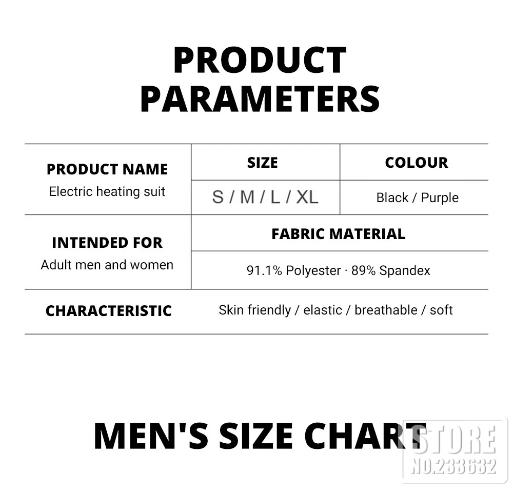 Specifications:Name: Heated Thermal UnderwearCondition: Brand NewColor: Black, purpleGender: Men, WomenMaterial: 91.1% Polyester + 8.9% Spandex, Carbon fiber wireHeating temperature: Red LED 50℃, White 45℃, Bule LED 35℃Power supply: USB power bank (Not include, 10000mah power bank can be heated for about 5-7 hours)Size: S, M, L, XL, 2XL, 3XL, 4XLSeason: Spring, Autumn, WinterPackage includes:1 x Heated Thermal Underwear Tops1 x Heated Thermal Underwear Pants(Note: Not included power bank)How to use :Charging – Fully charge the power bank, before use.Plug-in type-connects the power bank to a plug located in the pocket.On-Press and hold the on / off button for three seconds. The initial temperature is 50 degrees (red LED), the intermediate temperature is 45degrees (white LED), and the lowest 35 degrees (blue LED).Cleaning and maintenance :Machine washable. When washing, remove the power bank.In the case of machine washing, please wash your clothes in a laundry bag.To ensure the longevity of clothes, try to avoid strong washing and normal drying.
