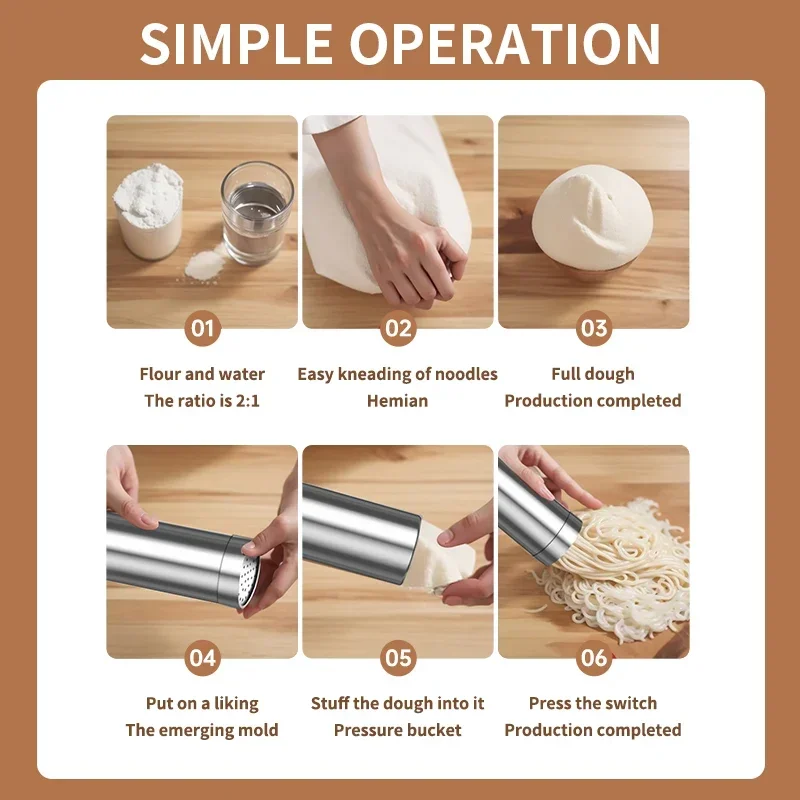 Smart Screen Display Power Multifunctional Noodle Machine, Wireless Handheld Noodle Machine, Portable Breakfast Machine Features: 1. Built-in large-capacity battery, which can continue to make 100 bowls of noodles, and has a power display 2. It can be disassembled and cleaned, clean and hygienic 3. 5 noodle models to satisfy different tastes 4. One-button operation, convenient and fast, 15 seconds can make 200 grams of noodles 5. Suitable for multiple scenes: school, home, outdoor, restaurant Specifications: Product Name: Electric Noodle Machine Material: ABS+ electronic components Voltage: 5V-2A Power: 40W BATTERY CAPACITY: 4000MAH Connector: Type-C/USB charging Gear adjustment: forward-off-reverse Product color: beige, white Product size: 21.5×5.6×22.5cm Package size: 26.5x7x25.3cm Noodles accessories: noodles tube, flat noodles Surface, coarse, wide, thin Weight: 1454g Packing list: 1 noodle machine, 5 molds 1 USB(Type-C)
